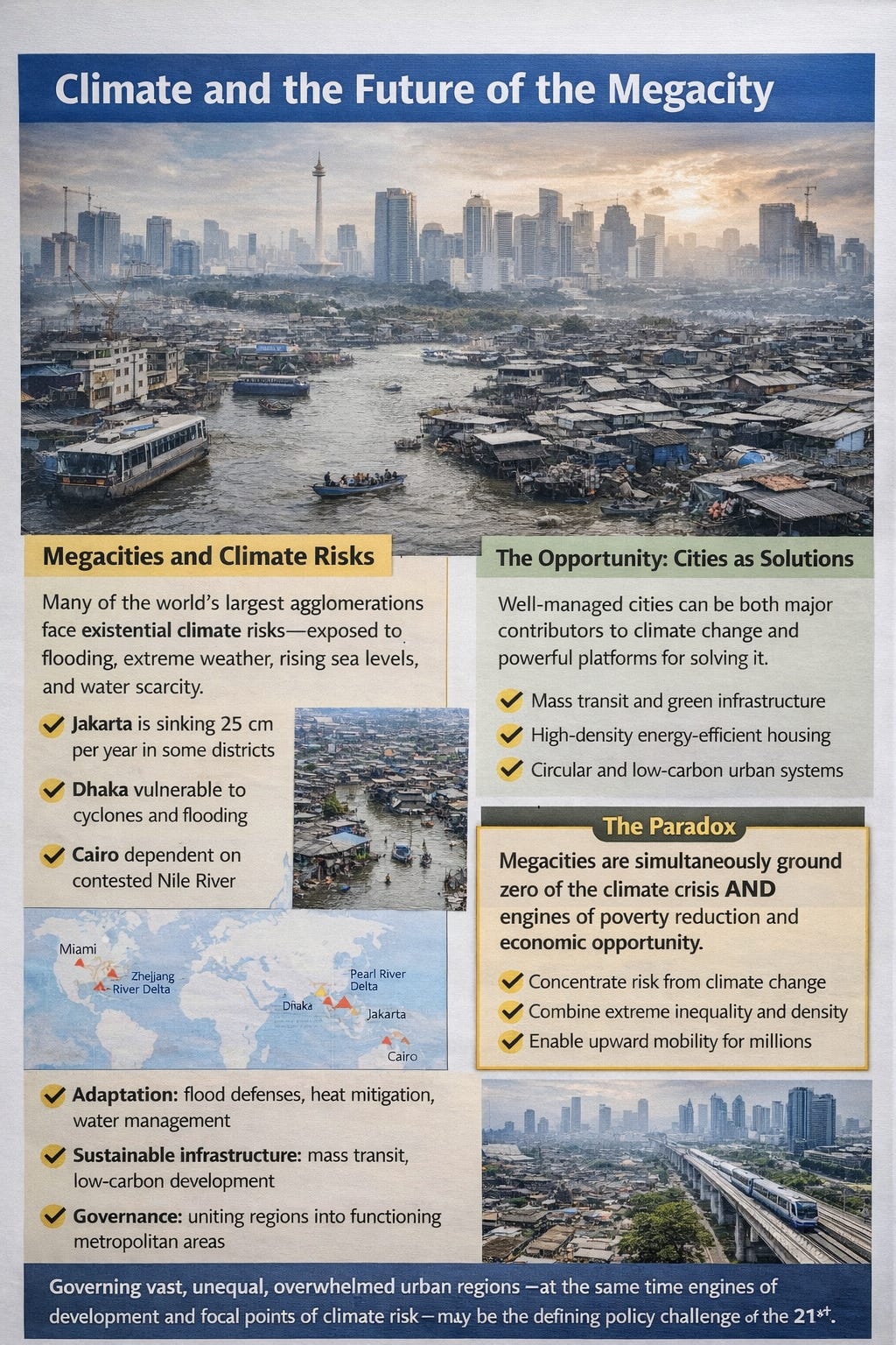 The world’s megacities are not merely mirrors of the climate crisis — they are both major contributors to it and among its most vulnerable victims. The intersection of urban concentration and climate risk is perhaps the defining policy challenge of the coming century.