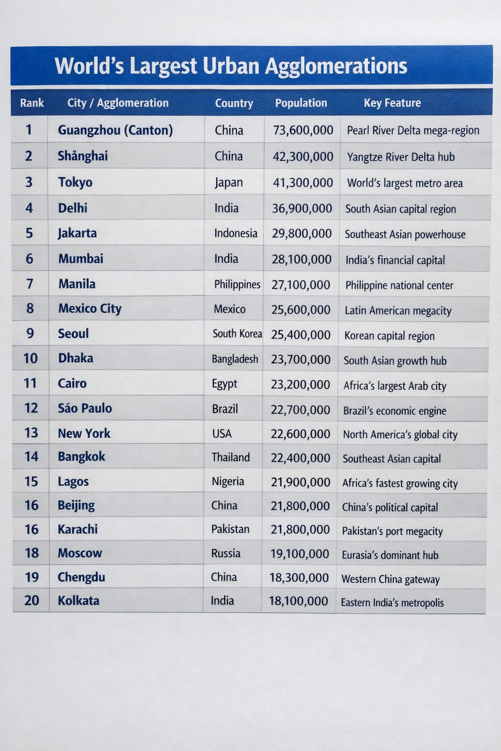 Understanding them — their populations, their structures, their challenges, and their extraordinary variety — is a prerequisite for understanding the world. From the Pearl River Delta’s 73.6 million to Taipei’s 10.2 million, from the ancient streets of Cairo to the brand-new skylines of Shenzhen, from the ordered precision of Tokyo to the improvised vitality of Lagos: these are the cities of our time. They are where we live. And they are, for better and worse, our future.