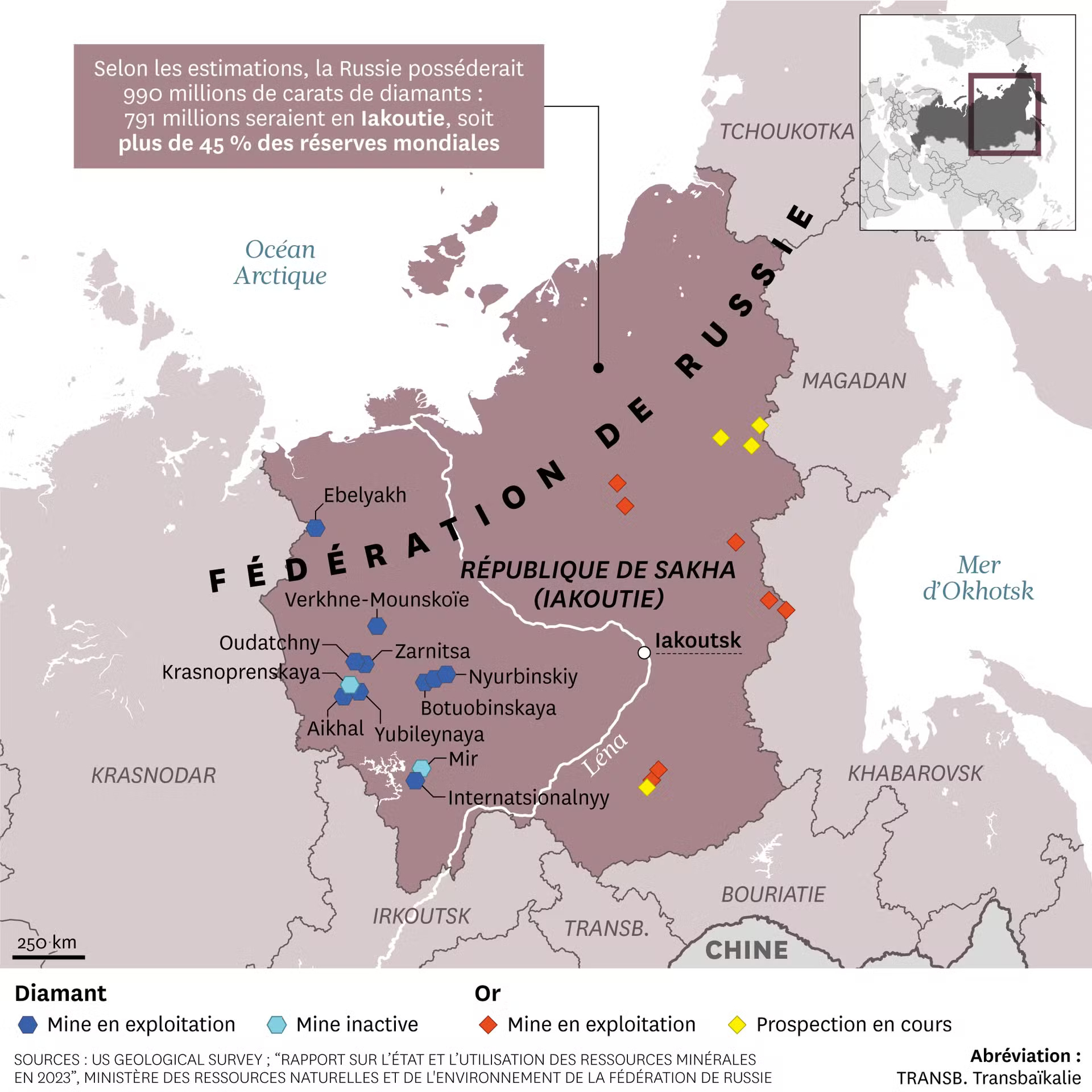 Cândva principalul producător mondial de diamante, Rusia - și în special Iacuția (cunoscută și sub numele de „Republica Sakha”) din Siberia - reprezenta încă 32% din producția globală în 2024. Dar, din cauza războiului din Ucraina, gigantul de stat Alrosa, responsabil pentru 90% din producția rusească, a fost vizat de sancțiuni americane, europene și din G7.