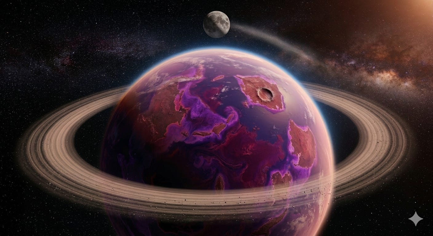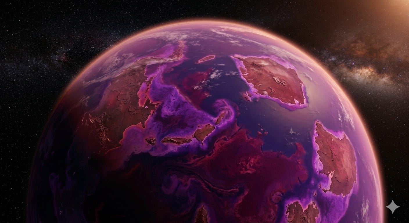 If you could travel back roughly 3 billion years and look down at Earth from orbit, scientists now believe you would not see a blue planet with green continents. You would see a world dominated by deep shades of violet and magenta — an alien landscape that looks nothing like home.