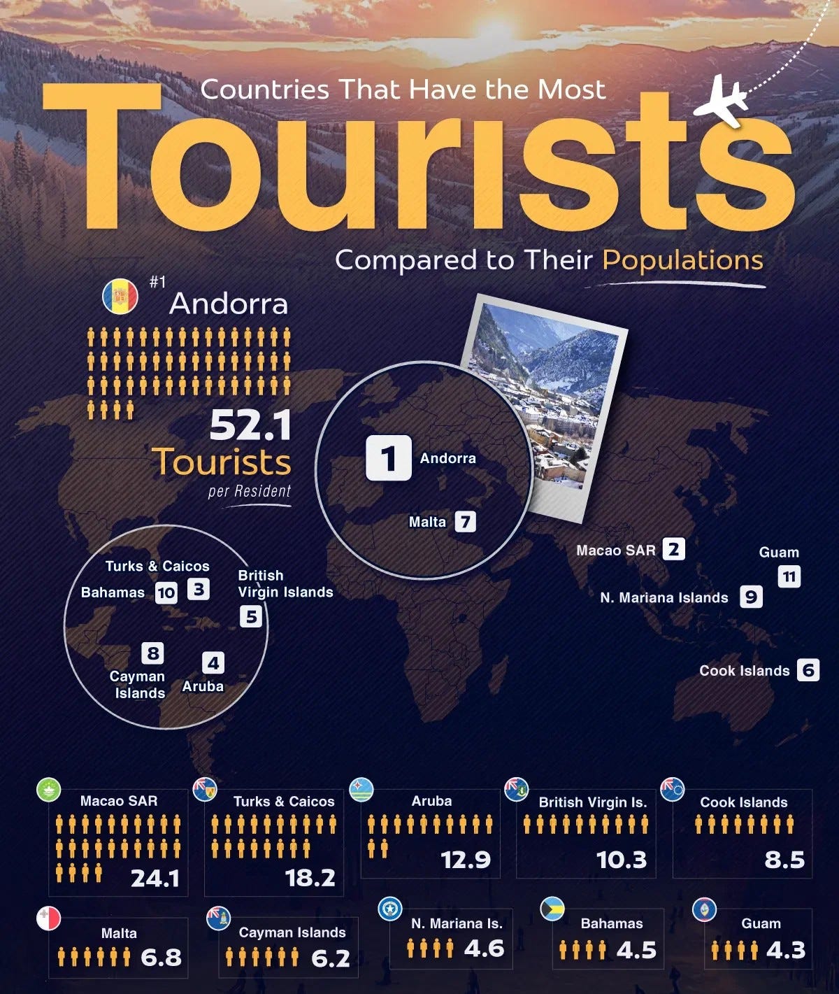 Microstatele și teritoriile mici domină lista, Andorra având o medie de peste 52 de turiști pe locuitor, iar Macao de 24.