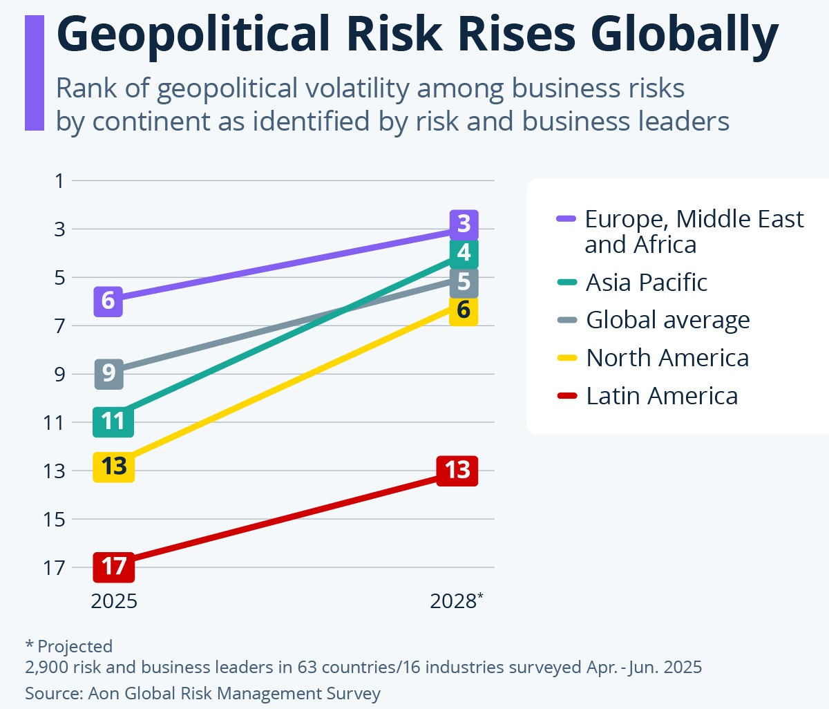 Conform unui raport recent publicat de Aon, volatilitatea geopolitică - împreună cu problemele legate de inteligența artificială - a fost riscul de afaceri cu cea mai rapidă creștere din lume. Riscul geopolitic a crescut de la locul 21 în 2023 la locul 9 în 2025 și, potrivit liderilor de afaceri, se așteaptă să urce în continuare până la locul 5 până în 2028. Între timp, riscurile legate de inteligența artificială au fost clasate pe locul 49 de către experții chestionați în 2023, înainte de a ajunge la locul 29 în 2025. Se preconizează că acestea vor ocupa locul opt în 2028.