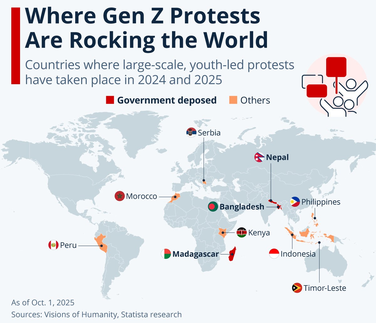 Proteste la scară largă, conduse de tineri, au zguduit recent țări din diferite părți ale lumii, ducând adesea la violențe, distrugeri și chiar la demiterea guvernelor. Acesta a fost cazul luni, când președintele Andry Rajoelina din Madagascar și-a dizolvat guvernul după ce 22 de persoane au murit și peste 100 au fost rănite în urma izbucnirii tulburărilor, declanșate de întreruperi de apă și electricitate. ONG-ul Visions of Humanity scrie că tinerii activi pe rețelele de socializare au condus proteste de acest gen, cerând nu doar îmbunătățiri ale condițiilor de viață, ci și schimbări mai ample în ceea ce privește responsabilitatea guvernului, egalitatea și lupta împotriva corupției.